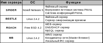 В сети существует 4 выделенных сервера, каждый из которых выполняет ряд полезных функций в масштабе всей сети. В таблице 3 приводятся данные о серверах: