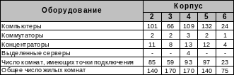 В следующей таблице представлено распределение активного сетевого оборудования и рабочих станций по корпусам, а так же число комнат, «охваченных» сетью: