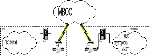 Рис.13. Связь ЛВС МИЭТ и студгородка МИЭТ посредством логического канала в московской волоконно-оптической сети (МВОС)
