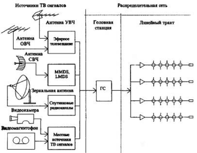 Первое звено – это головная станция (ГС), в которой производится дополнительная обработка ТВ радиосигнала. Эта обработка может включать в себя усиление сигналов до необходимого уровня; конвертирование ТВ сигналов с одного радиоканала в другой; преобразование стандарта ТВ сигнала; модуляцию видеосигнала и сигнала звукового сопровождения, полученных с местной студии и пр. На выходе ГС формируется ряд ТВ радиосигналов, соответствующих количеству принимаемых ТВ программ, который называют групповым телевизионным сигналом.