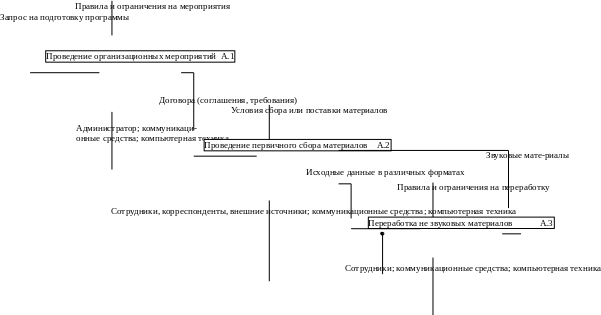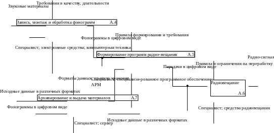 Технологические особенности производства программ на коммерческих радиостанциях, большая часть которых представлена диаграммой активностей - SADT-диаграммой (рисунок 1.4), включают организационные мероприятия, первичный сбор материалов, обработку и подготовку к эфиру текстовых материалов, студийную запись, монтаж и обработку фонограмм, формирование фонотеки и архивирование программ, составление сетки вещания, выпуск программы в эфир. На рисунке 1.5 в виде SADT-диаграммы детализирована активность "Формирование программ радиовещания".