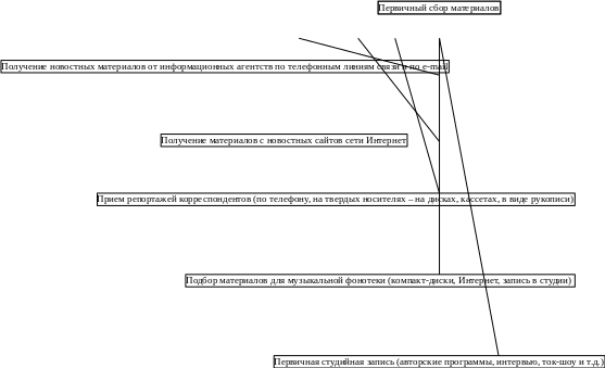 Первичный сбор материалов. Данный этап (рисунок 1.6) включает в себя сбор материалов для подготовки выпусков новостей, получение репортажей корреспондентов, подбор материалов для формирования музыкальной фонотеки (музыкальной базы) радиостанции, а также первичную студийную запись материалов.