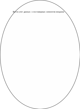 | Вести учет данных о поставщиках элементов вещания | Прецедент включает в себя прецеденты Запрашивать данные и Модифицировать данные. Он дает возможность пользователю накапливать и просматривать в различных режимах данные о поставщиках элементов вещания. |