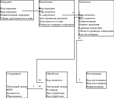 На основании разработанной выше информационной модели предметной области "Формирование программ радиовещания", которая представлена в виде диаграммы "сущность-связь" (ER-диаграммы) по разработанным специалистами прикладным правилам получены шесть таблиц базы данных (БД). Они составляют БД АРМ, для ведения которой потребуется реализация приложения БД. Сами таблицы также будут реализованы в спецчасти проекта. В состав таблиц входят следующие: Передачи, Элементы вещания, Включение (таблица для связи между таблицами Передачи и Элементы), Сотрудники, Обработка (таблица для связи между таблицами Элементы и Сотрудники), Поставщики. Сами таблицы, состав полей этих таблиц и связи между таблицами приведены на рисунке 1.9.