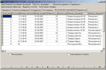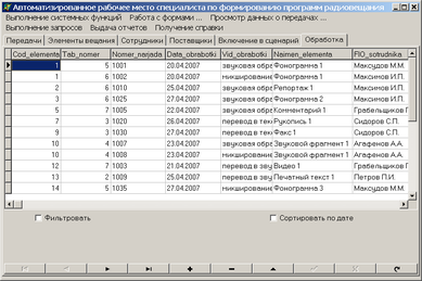 На закладках Передачи, Элементы вещания, поставщики и Сотрудники имеется возможность поиска нужной записи в табличной форме путем ввода нужного значения в поле ввода текста, причем поиск по ближнему соответствию начинается при вводе уже первого символа.