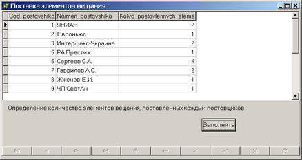 Рисунок 2.19 - Результат выдачи данных о количестве элементов вещания, поставленных каждым поставщиком.