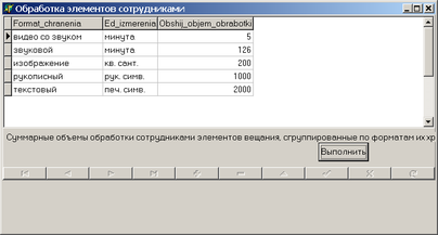 Рисунок 2.20 - Результат выдачи данных о суммарных объемах обработки сотрудниками элементов вещания, сгруппированных по форматам их хранения