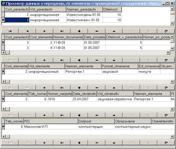 Для связного просмотра содержимого таблиц в данном проекте использована технология установления связей "Главная-подчиненная" ("Master-Detail") между наборами данных, представленными компонентами TTable, что позволяет пользователю видеть весь набор записей главной таблицы, менять в ней текущую запись, а в подчиненных таблицах видеть только записи, связанные с этой текущей. Связь "Передачи" - "Включение" - "Элементы вещания" - "Обработка" - "Сотрудники" организована программно: