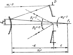 Принципиальная схема двухзеркалькой системы[6] показана на рис. 18. Расстояние с от вершины большого зеркала до плоскости изображения обычно оговаривается в технических условиях на расчет системы и зависит от конкретного назначения объектива. Будем считать, что центр входного зрачка совпадает с вершиной большого зеркала.