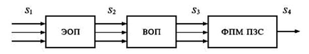ЭОП - электронно-оптический преобразователь с люминесцентным экраном на выходе; ВОП - волоконно-оптическая пластина; S1, S2, S3 - оптические сигналы: S1 - от объекта наблюдения и фона; S2 - от люминесцентного экрана ЭОП; S3 - после прохождения через ВОП; S4 - электрический сигнал на выходе ФПМ ПЗС.