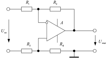 Так как синфазная помеха не превышает 10В и коэффициент усиления не большой, то достаточно будет взять простейший дифференциальный усилитель. Схема простейшего дифференциального усилителя представлена на рисунке 5.