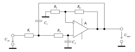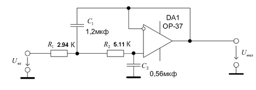 Принимаем схему фильтра низкой частоты по структуре Саллена-Ки, она показана на рисунке 8.