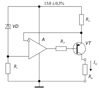 В качестве исходной схемы берем схему, представленную на рисунке 3. Необходимо выбрать стабилитрон VD. Для этого вычисляем необходимое напряжение стабилизации