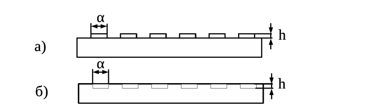 Рефлекторы реализуются с помощью системы металлизированных полосок на пьезоэлектрической подложке (рисунок 10а) или системы канавок (рисунок 10б), которые формируют путем травления.