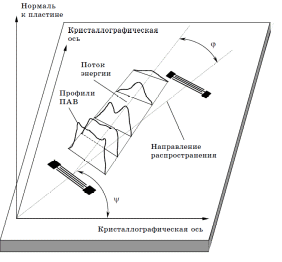 Если направление распространения ПАВ не совпадает с так называемым направлением чистой моды (ее угловое положение задается углом ψ0), то наблюдается отклонение потока энергии от направления распространения на угол φ (рисунок 2.3). Угол φ определяется соотношением: