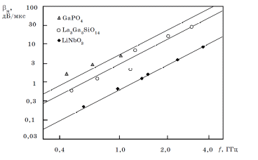 Рисунок 2.1 – Зависимости вносимых потерь от частоты при распространении ПАВ на поверхности монокристаллов ниобата лития, лангасита, ортофосфата галлия.