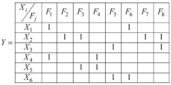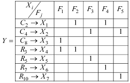 Идея метода сводится к оптимальному замещению дефектных элементов матрицы памяти, путем решения задачи покрытия дефектов-столбцов резервом строк. Для иллюстрации метода первоначально предлагается воспользоваться матрицей покрытия заданных неисправностей F некоторым количество строк (это могут быть тестовые наборы, резервные строки) X, причем: