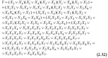 В данном случае аналитическая запись в виде булевой функции, представленной в виде КНФ, есть исходная модель, содержащая полное множество решений задачи покрытия, которая решается путем нахождения ДНФ. Для этого выполняется процедура преобразования КНФ в ДНФ путем перемножения всех термов. В результате эквивалентных преобразований, выполненных по правилам алгебры логики, получается булева функция, содержащая все возможные покрытия неисправностей, описанные с помощью четырех вариантов комбинаций строк: