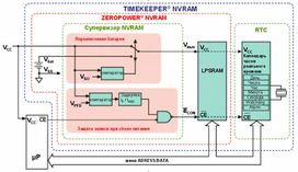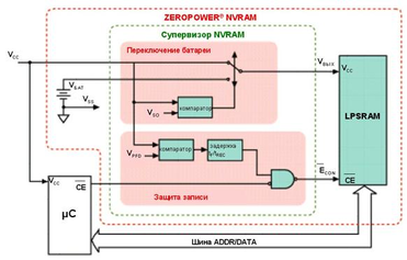 Супервизор NVRAM состоит из двух основных схем: схемы переключения батареи и схемы защиты записи. Схема переключения батареи переключает питание LPSRAM от системного стабилизированного источника питания (Vcc) на батарейное питание (Vbat). Эта схема осуществляет контроль за Vcc и когда оно начинает падать, питание LPSRAM переключается на резервную батарею.