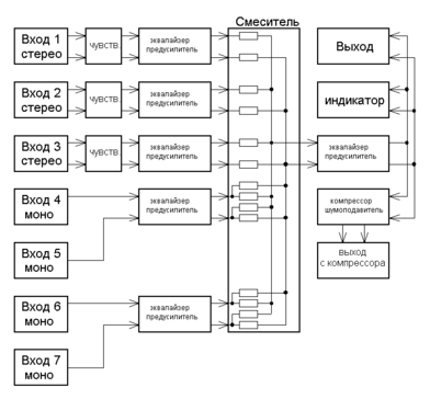Для уменьшения влияния на блоки других входов, смешение осуществляется с помощью резисторов.