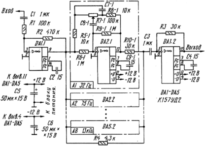Схема регулировки эквалайзера, баланса и громкости выполнена для стерео сигнала и состоит из 2-х одинаковых блоков.