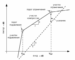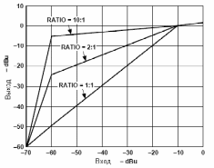 Регулировкой компрессии регулируется отношение характеристики выхода ко входу, это можно наблюдать на рисунке 2.15