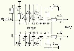 С увеличением амплитуды сигнала загораются большее число светодиодов на шкале, первый горит постоянно. Шкала логарифмическая, что наиболее подходящая для слежения за звуковым сигналом. Последний светодиод загорается, когда амплитуда сигнала превышает нормальную.