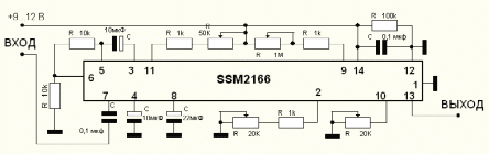 Сигнал поступает на вход микросхемы через разделительный конденсатор. Проходит через операционный усилитель и через разделительный конденсатор вне микросхемы проходит на блок эффектов, который регулируется с помощью резисторов, подключенных в выводам микросхемы.