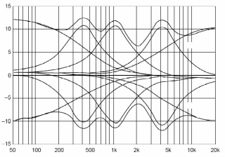 Регулировка эквалайзера осуществлена без индикаторов 5-ю переменными резисторами. Регулируются такие полосы: 100 Гц, 400 Гц, 1 кГц, 4 кГц, 10 кГц. Амплитудно-частотная характеристика представлена на рисунке 2.8.