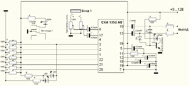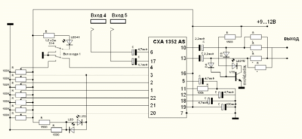 Для осуществления выключения входа используется переключатель, включенный после резистора регулировки громкости. Во включенном состоянии на микросхему подается напряжение с резистора, и загорается светодиод, показывающий включение входа. При выключенном состоянии на вывод микросхемы регулировки громкости подается «0», и индикатор включения входа тухнет, тем самым имитируя нулевую громкость, т.е. на выходе микросхемы сигнал не будет присутствовать.