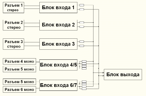 Входа 4,5,6,7 моно, и особенностью смешивания является то, что они выполнены на 2-х стерео блоках, и каждый вход через резисторы смешивается в оба канала (правый и левый).