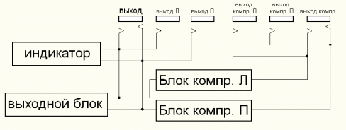 Сигнал еще проходит в блок компрессора, который состоит из 2-х одинаковых схем и служит для обработки левого и правого каналов. После блоков компрессора сигнал поступает на выходы, которых тоже 3 (1 стерео и 2 моно), что позволяет подключить несколько устройств к выходу.