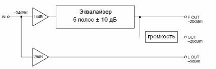 Как видно, сигнал усиливается на 14 дБ и проходит через 5-ти полосный эквалайзер, где осуществляется регулировка + 10 дБ каждой полосы. После этого сигнал проходит через регулировку громкости и проходит на выход. Остальные входы (F OUT и L OUT) мы не используем. Из 1-го выхода выходит сигнал просто усиленный со входа на 29 дб, не проходя через эквалайзер и регулировку громкости. 2-й – выход не проходя через регулировку громкости, напрямую от эквалайзера.