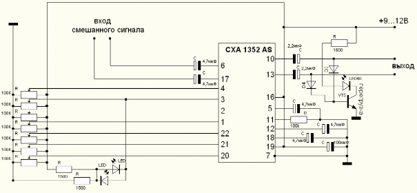 Далее сигнал проходит через резисторы, где он ослабляется и дальше происходит смешивание.
