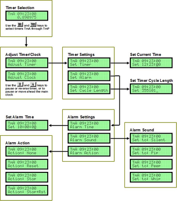 Сразу после включения питания часов, мы попадем в меню «Выбор Таймера». В этом режиме можно просмотреть все 16 таймеров, от TmA до TmP (как и с любым меню, используйте кнопки [TKO] и [DEL] для выбора таймеров). Если вы не уверены, в каком меню вы находитесь, нажмите кнопку [ABT] несколько раз, это приведет вас в главное меню.