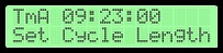 Чтобы настроить таймер на какой ни будь другой, отличный от стандартного земного (24 часа), временной цикл, выберите опцию Set Cycle Lengt. Более детальная информация и примеры длин циклов (например, как заставить таймер считать марсианское время), находятся в разделе How-To, пункт «Установка длинны цикла таймера». Подтвердите установку новой длинны цикла кнопкой [ENT] или отмените операцию нажав кнопку [ABT] в любой момент.