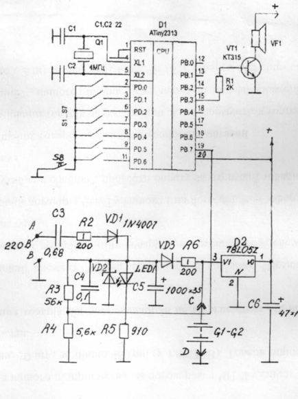 Схема принципиальная электрическая музыкального звонка с двумя режимами работы: автономный и от сети