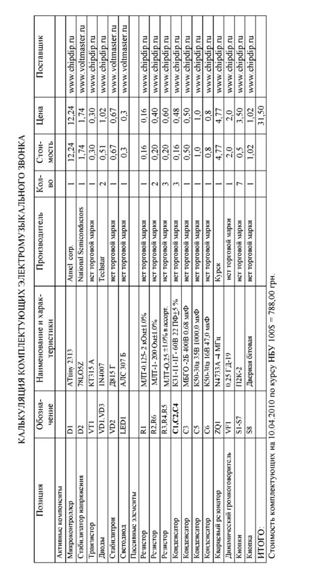 Калькуляция комплектующих электромузыкального звонка