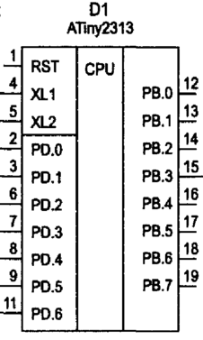 ATtiny2313 - низкопотребляющий 8 битный КМОП микроконтроллер с AVR RISC архитектурой. Выполняя команды за один цикл, ATtiny2313 достигает производительности 1 MIPS при частоте задающего генератора 1 МГц, что позволяет разработчику оптимизировать отношение потребления к производительности.
