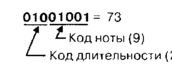 Итак, если использовать приведенный выше способ кодирования, то код ноты ля первой октавы длительностью 1/4 в двоичном виде будет равен: