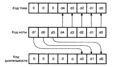 Для экономии памяти удобнее каждую ноту кодировать одним байтом. Договоримся, что три старших бита мы будем использовать для кодирования длительности ноты, а оставшиеся пять битов — для кодирования ее тона. Пятью битами можно закодировать до 32 разных нот, что вполне хватит для электромузыкального звонка.