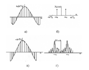 Рисунок 1.2 – Размывание спектра: (а – исходная бесконечная последовательность; б – модуль преобразования Фурье от х0 [nТ0]; в - последовательность х0 [nТ0], умноженная на прямоугольное окно; г - модуль преобразования Фурье последовательности х[nТ0])