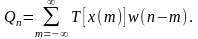 Речевой сигнал (возможно, после ограничения частотного диапазона в линейном фильтре) подвергается преобразованию Т[·], линейному или нелинейному, которое может зависеть от некоторого управляющего параметра или их совокупности. Результирующая последовательность умножается затем на последовательность значений временного окна (весовой функции), расположенную во времени в соответствии с индексом п. Результаты затем суммируются по всем ненулевым значениям. Обычно, хотя и не всегда, последовательность значений временного окна имеет конечную протяженность. Значение Qn представляет собой, таким образом, «взвешенное» среднее значение последовательности Т [х (m)].