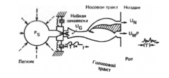 Понятие звука почти совпадает с понятием колебаний. Звуковые волны возникают за счет колебаний. Они распространяются в воздухе или другой среде с помощью колебаний частиц этой среды. Следовательно, образование и распространение звуков в голосовом тракте подчиняется законам физики. В частности, основные законы сохранения массы, сохранения энергии, сохранения количества движения вместе с законами термодинамики и механики жидкостей применимы к сжимаемому воздушному потоку с низкой вязкостью, который является средой распространения звуков речи. Используя эти основные физические законы, можно составить систему дифференциальных уравнений в частных производных, описывающую движение воздуха в речеобразующей системе [1,2]. Составление и решение этих уравнений весьма затруднительны даже для простых предположений относительно формы голосового тракта и потерь энергии в речеобразующей системе. Полная акустическая теория должна учитывать следующие факторы: