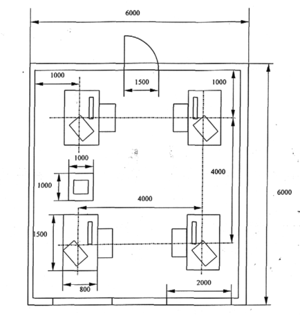 В лаборатории одновременно работают четыре человека в смену. В лаборатории размещены пять столов, четыре стула, четыре системных блока и монитора и один принтер. План помещения с размещенным в нем оборудованием приведен на рисунке 12.1.