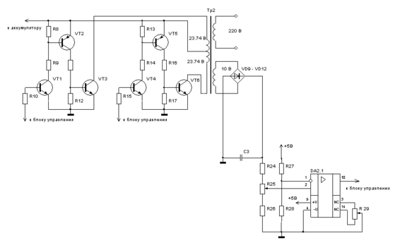 Компаратор 1 -сравнивает напряжение на выходе выпрямителя с напряжение с выхода аккумулятора в аварийном режиме. Если напряжение на выходе выпрямителя меньше, то напряжение на выходе компаратора равно 0 В, что соответствует низкому уровню сигнала (лог.0) для блока управления.