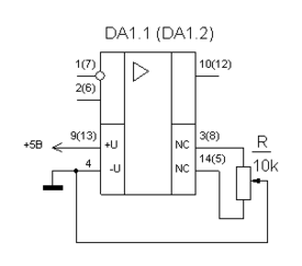 На неинвертирующий вход DA1.1 подается напряжение с выхода выпрямителя VD5-VD8 через делитель R1, R2, R3 с коэффициентом деления обеспечивающим напряжение +5 В. Исходя из параметров ОУ и выпрямленного напряжения + 29 В выбираем сопротивления из ряда Е24 R1=47 кОм, R3=5.1 кОм. Сопротивление R2=10 кОм переменное и обеспечивает плавную подстройку напряжения срабатывания компаратора.