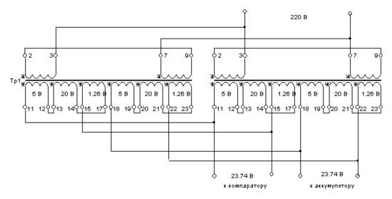 Схема включения обмоток для получения напряжения U2 =23.8 В