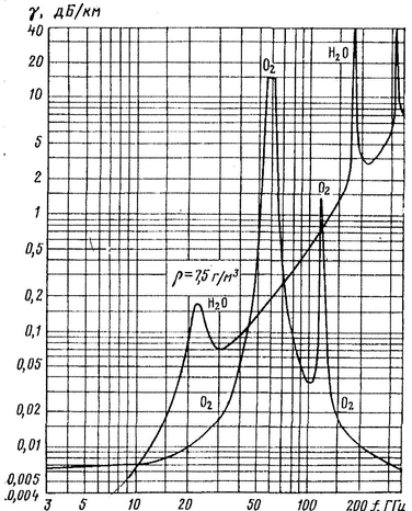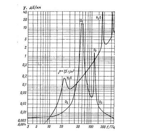 Основное поглощение энергии сигнала вызывают кислород и водяной пар. На рисунке 5 показаны теоретические зависимости погонного ослабления уровня сигнала у, дБ/км, от частоты при стандартном давлении воздуха, температуре 20°С и концентрации р водяного пара 7,5 г/м3.