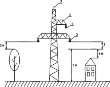 Прохождение ВЛ над зданиями и сооружениями запрещается, исключение составляют производственные здания и сооружения, выполненные из несгораемых материалов. При этом расстояние по вертикали от проводов ВЛ до здания должно составлять не менее 5 метров.